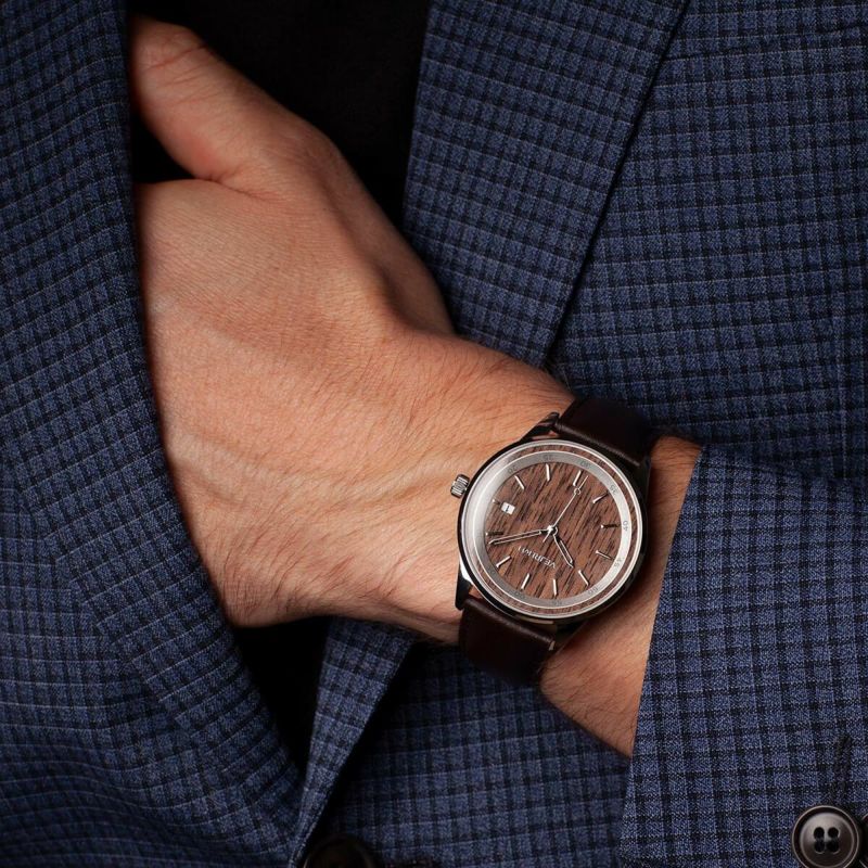 時計のすべての木製部品は、強固なサファイアガラスの下に配置されているため、スチール製の時計と同等の耐久性を持っています。ムーブメントが見える透明なケースバックに沿って、ひとつひとつの製品にシリアルナンバーが刻まれています。くるみの木を使用した文字盤には 、アワーマークとカレンダーがあります。