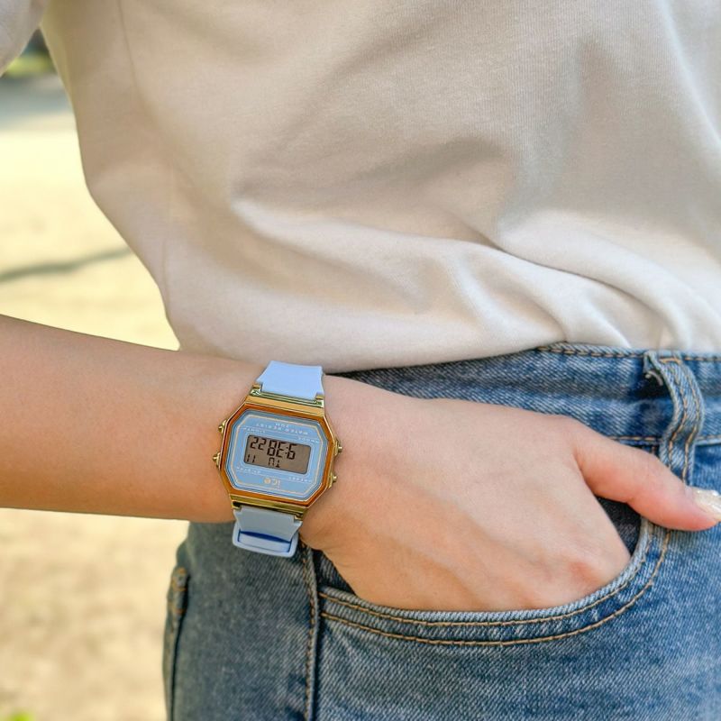 「アイス デジットレトロ」はその名の通り流線的な八角形のレトロなデザインが特徴。現代風にアレンジを加え、イエローゴールドのベゼルとプリントをアクセントに、文字盤とベルトのカラーを合わせたスタイリッシュな印象に。驚くべきは圧倒的なカラーバリエーションで、ビビッドカラーからグレーがかったニュアンスカラーまで、全14色がラインナップされる。ケースは軽量で薄型のプラスチックプレート、風防は透明性と耐衝撃性に優れたアクリルガラス、ストラップは肌なじみがよく柔らかいブランドの代名詞ともいえるシリコンラバーを採用。ケース径32mm。3気圧防水。時刻、日付、曜日の表示に加え、ストップウォッチ、アラーム、バックライト、デュアルタイムの機能付き。