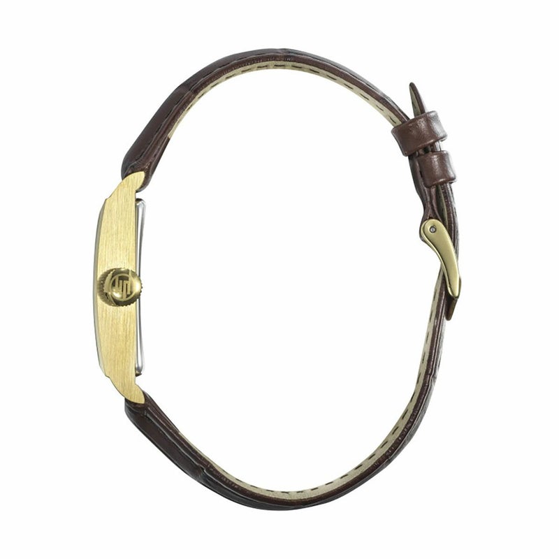 チャーチル T18 ウォッチは、ウィンストン・チャーチルに贈られた 1930 年代の T18 モデルの復刻版です。長さ 38.5 mm、幅 21.2 mm の金メッキ、ポリッシュ仕上げ、ブラッシュ仕上げの 316L ステンレススチール製ケースを備え、男性にも女性にも着用できます。シルバーのギョーシェ模様の文字盤には、青い剣型の針が付いています。クロコダイル スタイルの茶色の牛革ストラップは、ピン バックルで留めます。どんな手首にも合う、素晴らしいクラシックです。