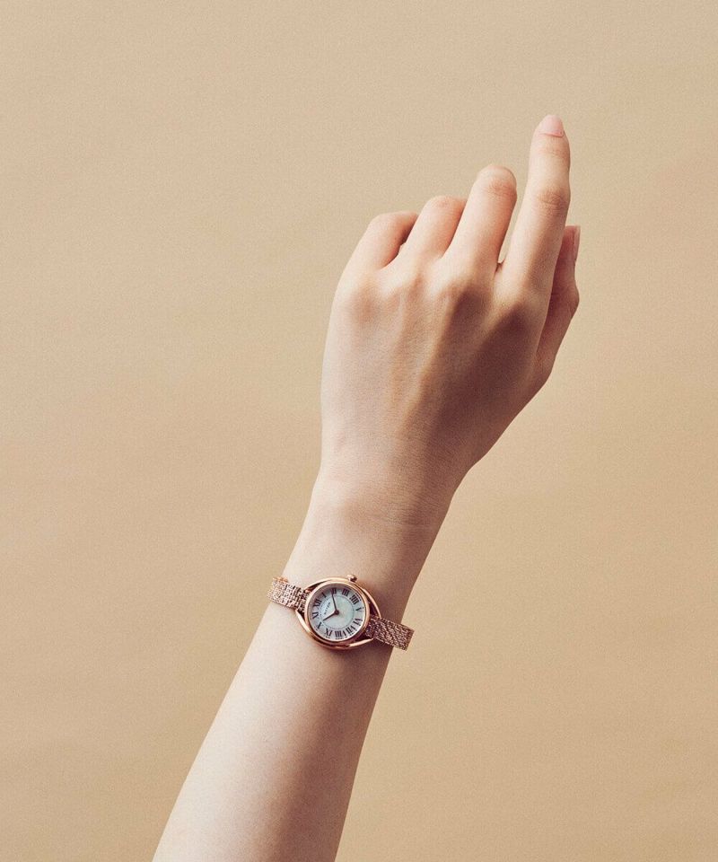 華麗に絡み合うきめの細かい8mm幅のメッシュベルトは、煌びやかで美しいうつろいを纏う。着飾るときのためのものとして生まれた飾り花を纏うことで、全ての女性を手元から輝かせる。
