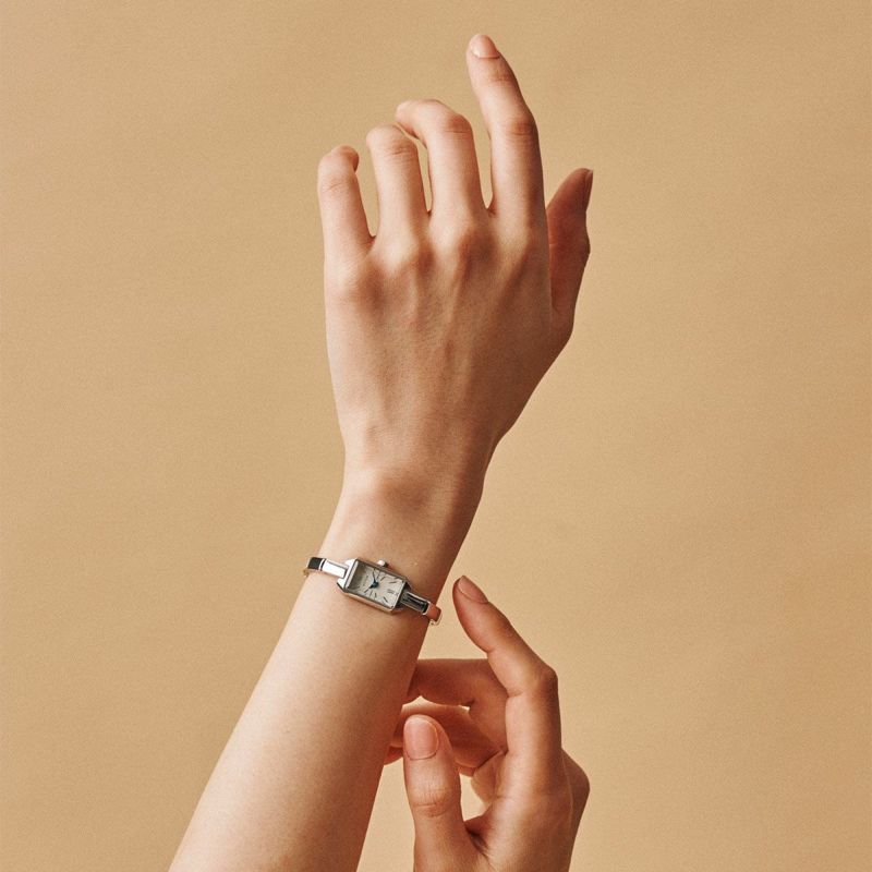 手首にすっと馴染むコンパクトなサイズ感は、華奢でありながら確かな存在感を演出します。