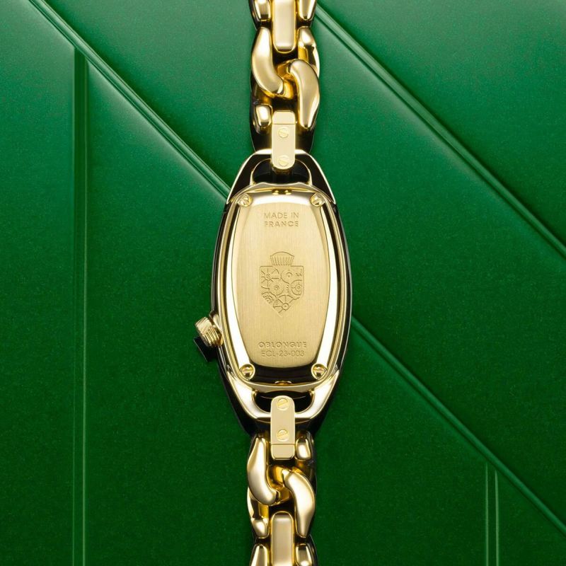 独自のオブロング型ケースは、手首に美しくフィットする優美な輪郭を描きます。オーバル型のクラウンとバックルにもこだわりが光り、ブランドの象徴であるラインがさりげなく刻まれています。