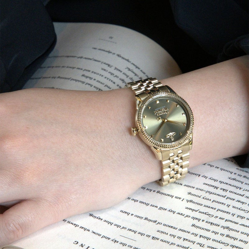 32mmのゴールドトーン・ステンレススチールケースとブレスレットに、深みのあるオリーブグリーンのダイヤルを組み合わせ、大胆でありながら気品も感じさせる仕上がりに。