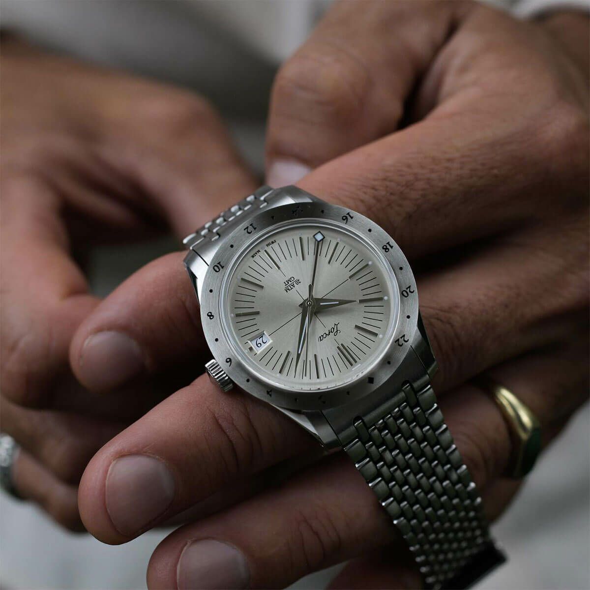 他の画像を見る Nivada Grenchen / ニバダ グレンヒェン クロノマスター ブロードアロー 5カラーベゼルセット ステンレススチール ライスブレスレット / オープンケースバック ¥ 407,000 税込
