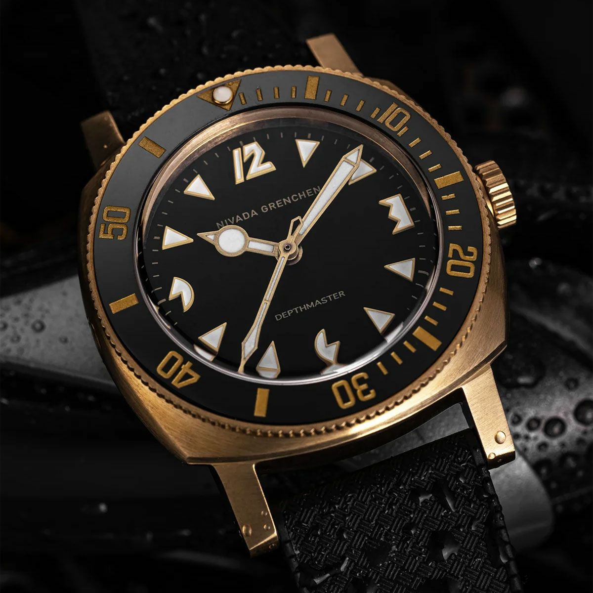 他の画像を見る Nivada Grenchen / ニバダ グレンヒェン スーパーアンタークティック 35mm ブラック ベージュ イエローマーカー ルミノバ ブラウン レザーレーシングストラップ ¥ 159,500 税込