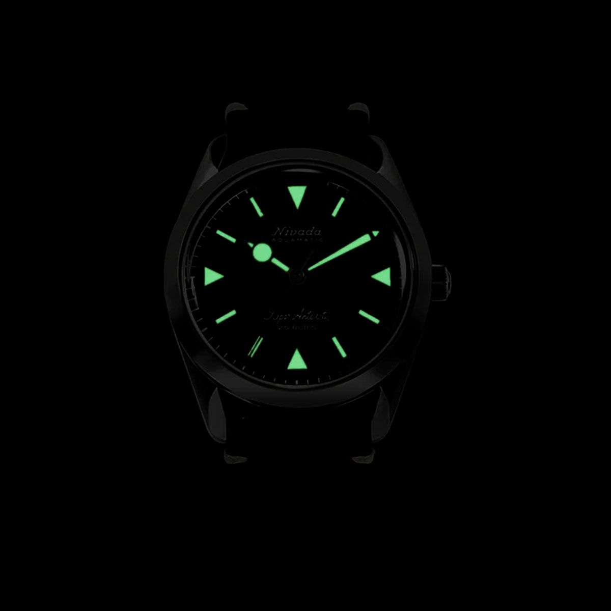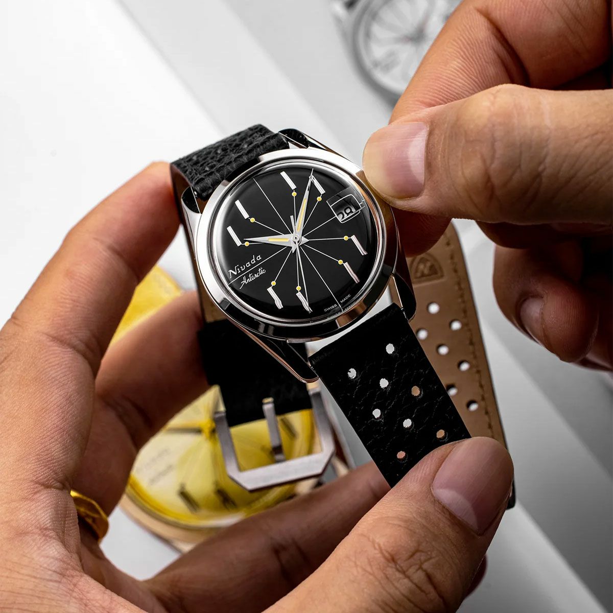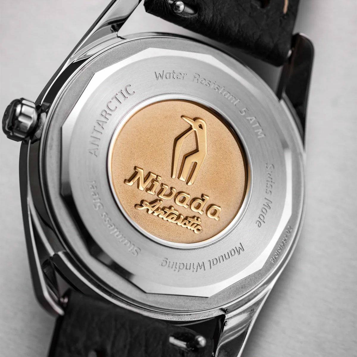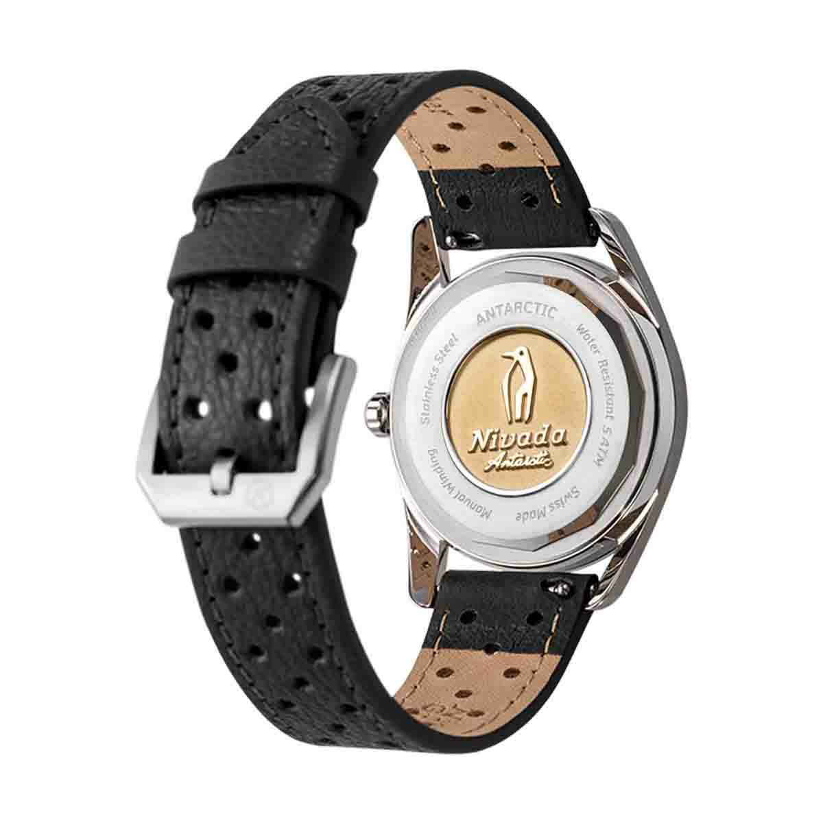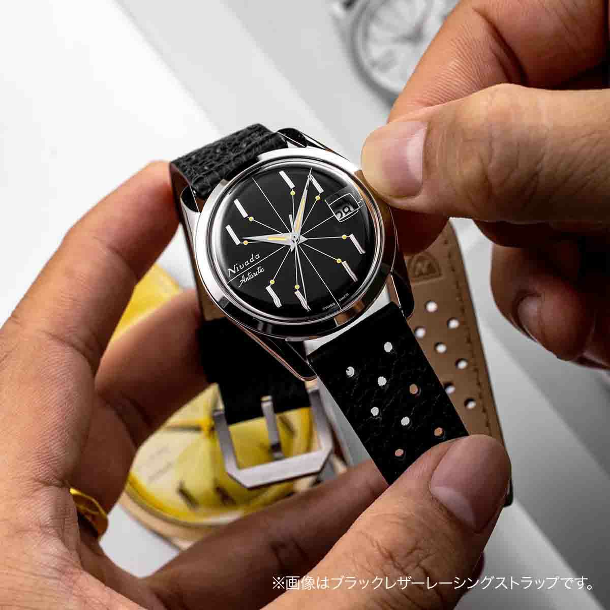 他の画像を見る Nivada Grenchen / ニバダ グレンヒェン スーパーアンタークティック 35mm ブラック ホワイトマーカー ルミノバ ブラウン レザーレーシングストラップ ¥ 159,500 税込