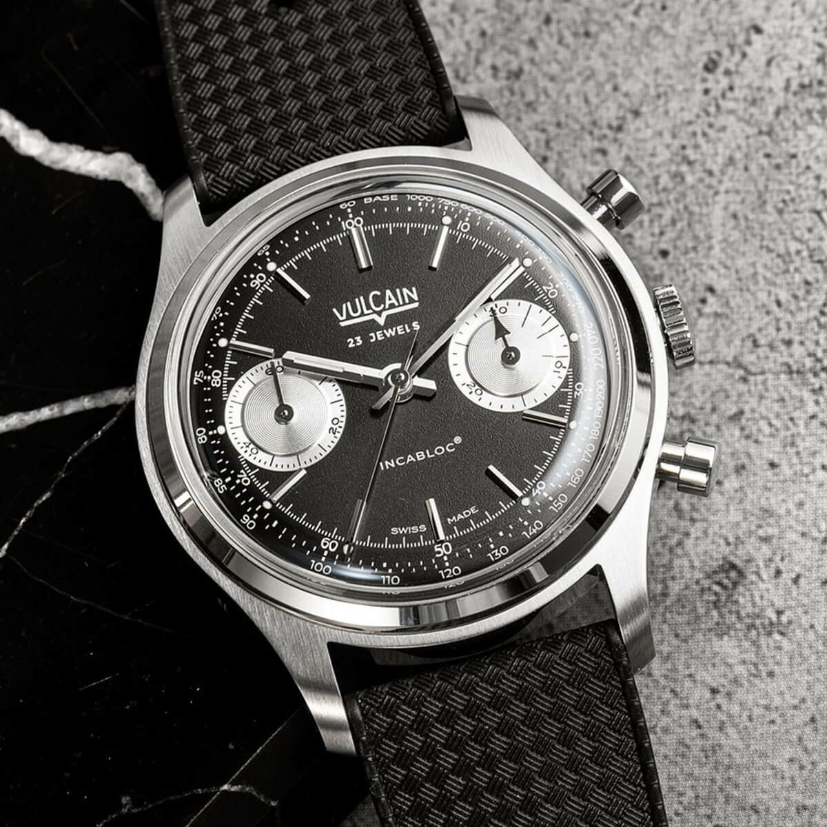 Sold out. 他の画像を見る VULCAIN / ヴァルカン 1970's クロノグラフ ステンレススティール ケース ブラック ダイアル シルバー カウンター ブラック カーフレザー イミテーション アリゲーター ストラップ スチール ピンバックル ¥ 412,500 税込