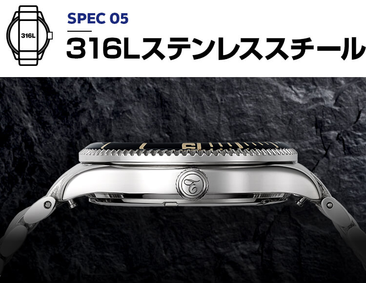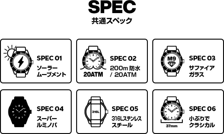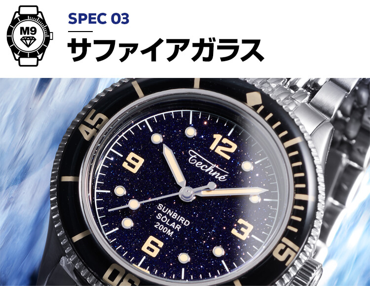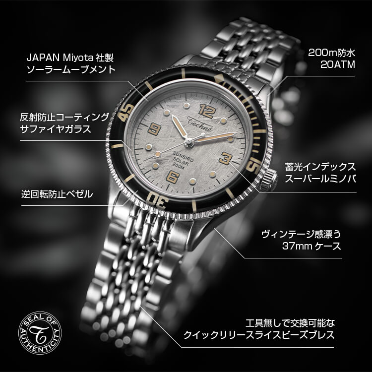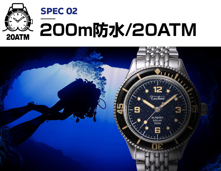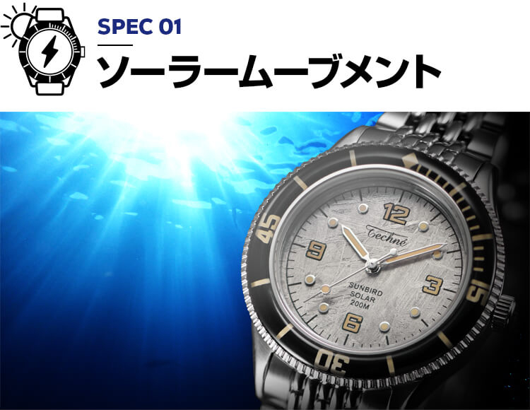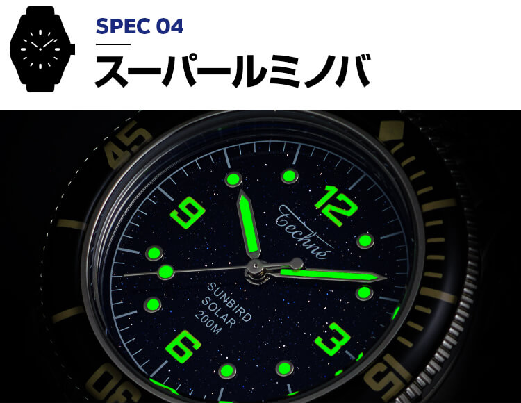 ガラスの淵から光を吸収するSUNBIRDソーラームーブメントに、200M防水のダイバーズ機能と反射防止サファイアガラスを搭載。強力な蓄光インデックスで視認性を高め、ステンレススチール316Lを使用。