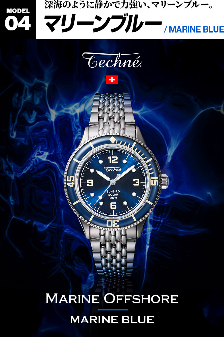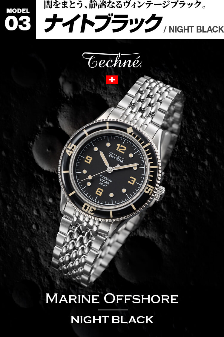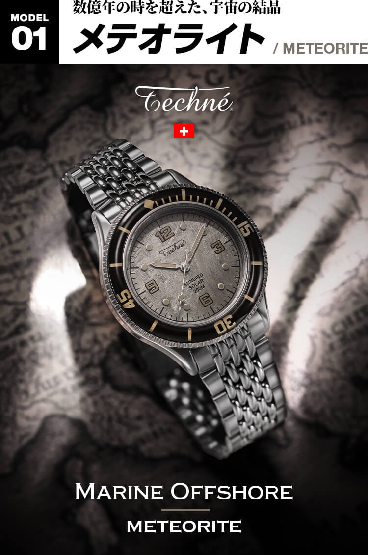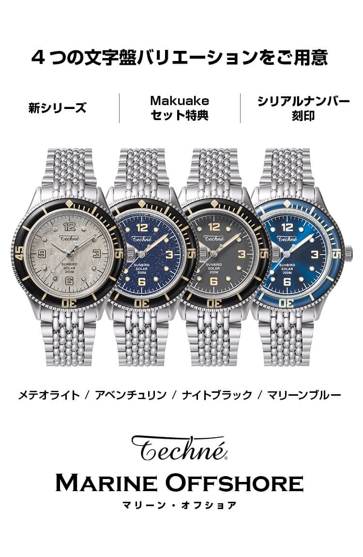 構想1年、製作2年の歳月をかけ、ようやく完成したテクネの新型は「マリーンオフショア」シリーズ。1970年代頃のヴィンテージスタイルをコンセプトに、37㎜と小ぶりなケースサイズに、当時多く使われていたライスブレスレットを採用。(ベルト交換が簡単にできるレバーピン式バネ棒を使用)