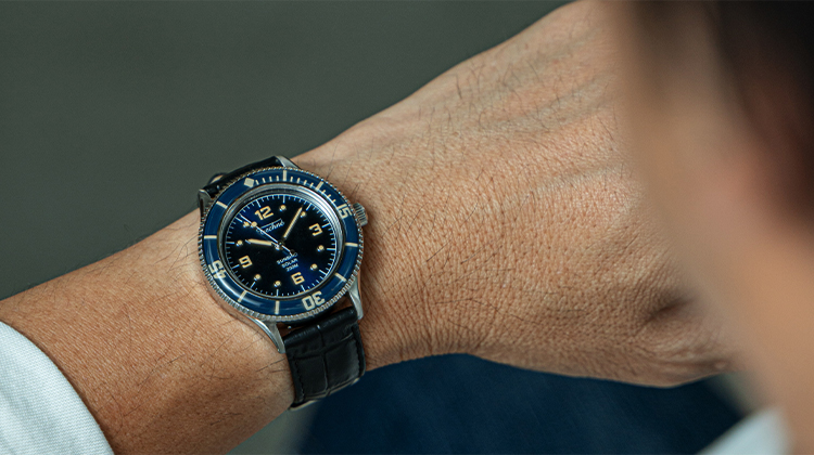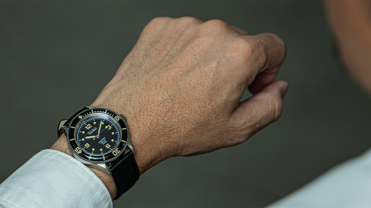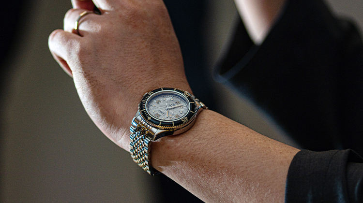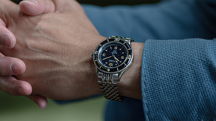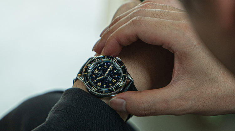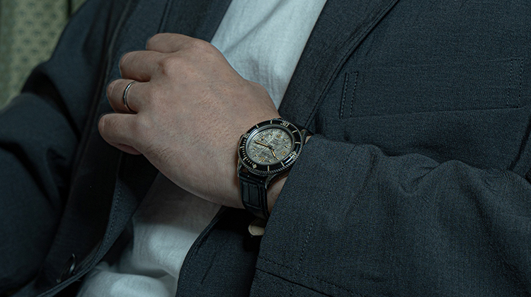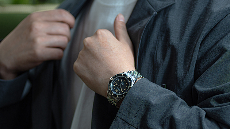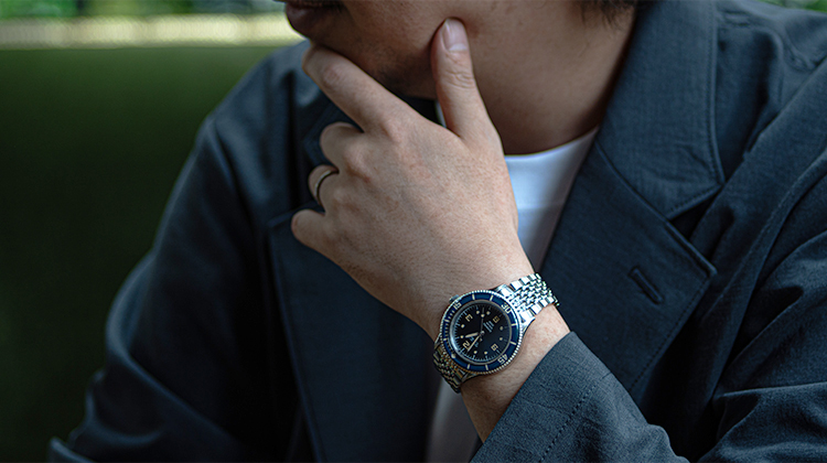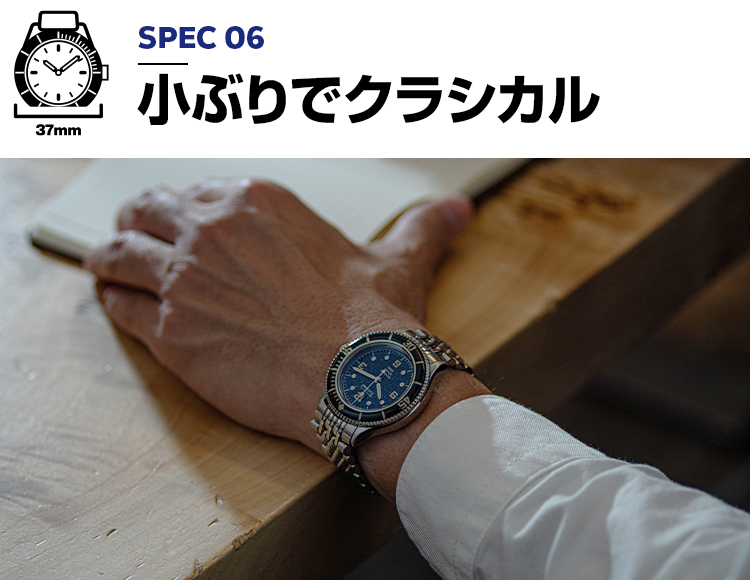 構想1年、製作2年の歳月をかけ、ようやく完成したテクネの新型は「マリーンオフショア」シリーズ。1970年代頃のヴィンテージスタイルをコンセプトに、37㎜と小ぶりなケースサイズに、当時多く使われていたライスブレスレットを採用。(ベルト交換が簡単にできるレバーピン式バネ棒を使用)