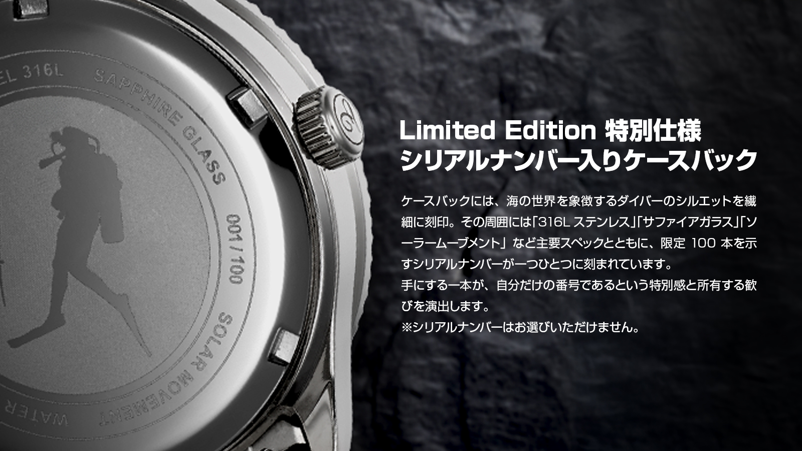 各モデルは初回生産限定100本(シリアルナンバー入り)。高級時計にも劣らぬ高スペックでありながら、コストパフォーマンスと実用性を重視した価格で実現いたしました。