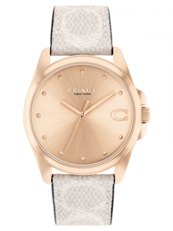 1920年代のアールデコからインスパイアされたケイディの新作は17.5×28.5mmのレクタンギュラーのケースに、コーチのCチャームとティーローズのモチーフをあしらったレザーストラップを合わせエレガントな仕上がりに。ベージュカラーのレザーベルトにはマザーオブパールの文字盤、ピンクカラーのレザーベルトには薄ピンクのサンレイダイアルを組み合わせ、文字盤中央には馬と馬車のモチーフがデザインされている。