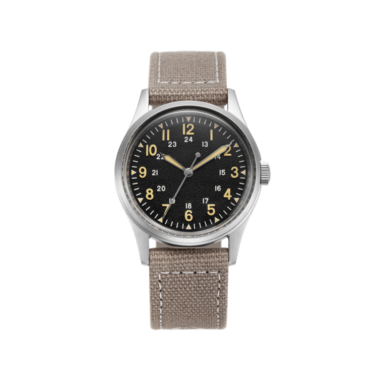 「A-11」は、1942年に米軍によって開発され、米兵士たちにシンプルでありながら効率的な時刻計測を提供するために作られたフィールドウォッチ。現代の精度と快適さを追求しオリジナルを忠実に再現し現代版へとアップデート。ブラックダイヤルには、低光環境でも視認性を高めるために設計されたルミナスインデックスが搭載されている。ムーブメントには、長年の信頼性と高いコストパフォーマンスを兼ね備えた頑丈なTMI NH35自動巻きムーブメントを採用。