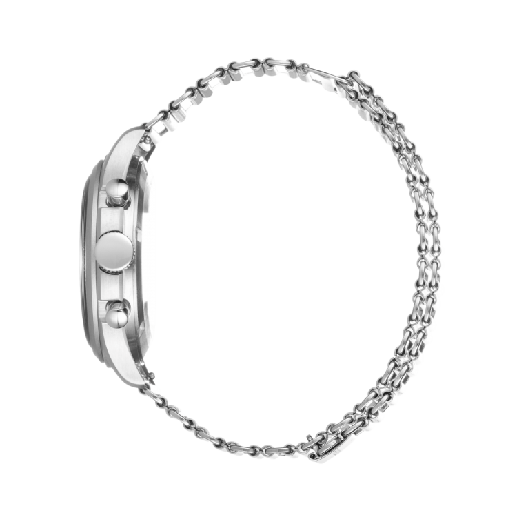 「PAC-76」は、1970年代の軍用アナログクロノグラフを復活させたモデルで、視認性とレトロな美学を兼ね備えている。米空軍や英国空軍で使用されたバイコンパックスクロノグラフにインスパイアされ、パイロットが飛行中の計算に使った伝統的なデザインを現代風にアレンジ。異なるテクスチャーの文字盤や立体的なインデックスで視認性を向上させている。バンクリップブレスレットは、1940年代のフィールドブレスレットのデザインで、PAC-76と絶妙にマッチする軽量で柔軟なフィット感を提供。光沢のある仕上げがケースと調和し、フィールドでもエレガントなスタイルを演出している。