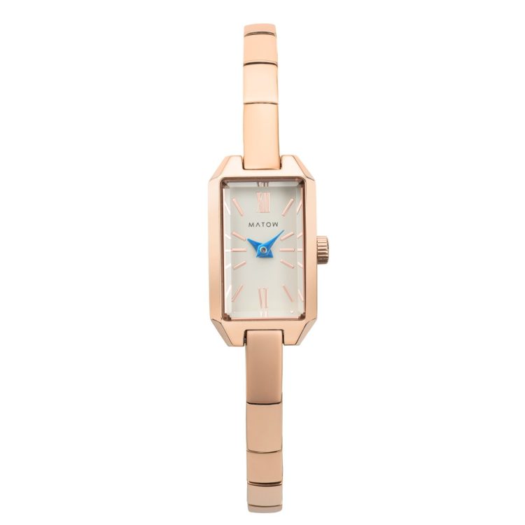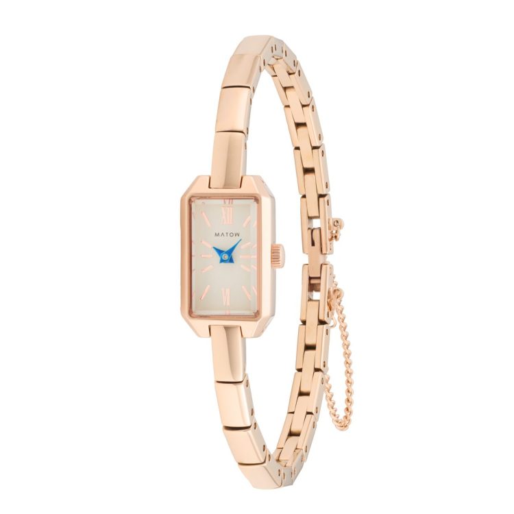 「清月/ミニスクエア」は、そんな静かに輝く月の情景を時計のフォルムやディテールに落とし込みました。細身のスクエアケースは、夜空に浮かぶ月のように洗練され、無駄のないシルエット。手首にすっと馴染むコンパクトなサイズ感は、華奢でありながら確かな存在感を演出します。文字盤の繊細なインデックスは、月光が水面にそっと映るような柔らかな輝きを放ち、青針のアクセントが夜の静寂を思わせる深みを加えます。職人の手によって細部まで丁寧に仕上げられ、時代を超えて愛される一本となるように仕立てました。縦23mm×横13mmのコンパクトなレクタングルケースは、ローズゴールドとシルバーの2種類をラインナップ。それぞれケース同色のメタルベルトを備え、手首に馴染むように設計されています。さらに、バックル部分には細身のチェーンが付属し、ジュエリーのように楽しめる仕様に。シンプルながらも、手元に洗練された輝きを添えるデザインとなっています。都会の喧騒から一歩離れ、静かに自分と向き合う時間を持ちたい。そんな大人の女性に寄り添う時計です。オンタイムには端正な品格を添え、オフタイムには優雅なリラックス感を演出します。移ろいゆく時間の美しさを、手元でそっと感じてください。
