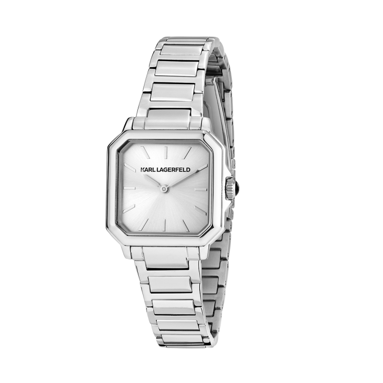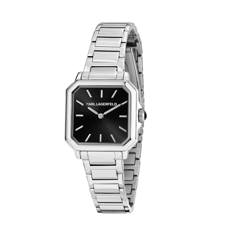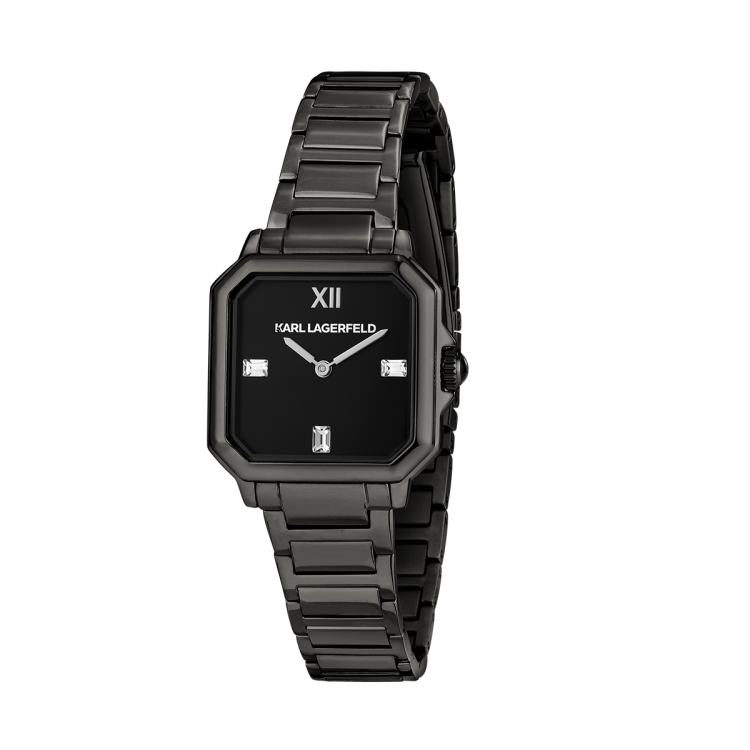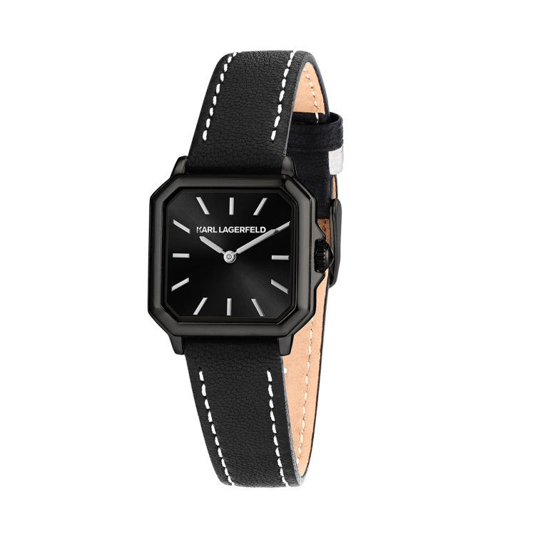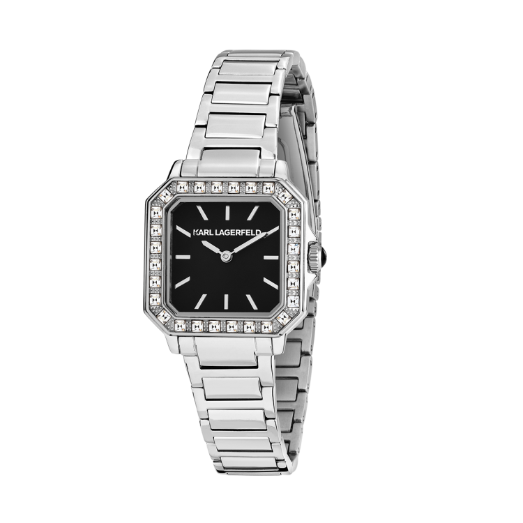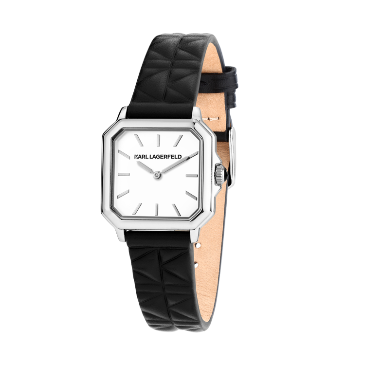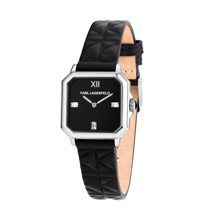 スクエア型のクリスタルベゼルが輝きを放つモデル。ブレスレット中央にはファセットカットのディテールを施し、クラウンにはブラックエナメルのカボションをセット。ダイヤルにはサンレイ加工やダイヤモンドダスト仕上げが施され、モダンなエレガンスを演出します。ブラックまたはホワイトで展開されるエレガントなレザーベルトモデルは、バゲットクリスタルやバトンインデックスが特徴。「K」マトラッセパターンとスムースレザーのコントラストが美しく際立ち、モード感溢れるデザインに仕上げられています。