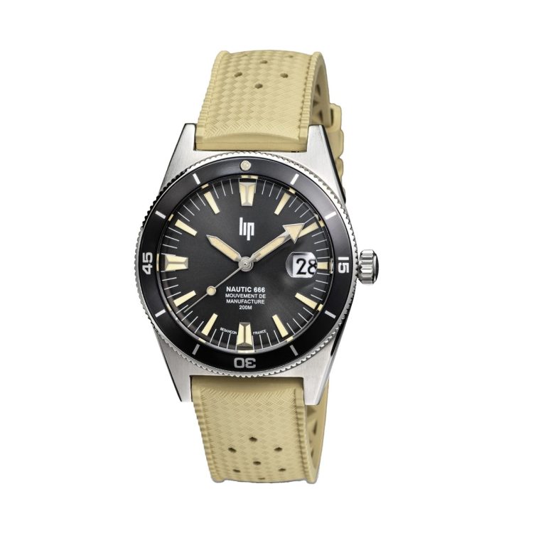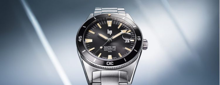 1960年代末、LIPが北米市場に投入したダイバーズウォッチ「Nautic 666」は、最大防水深度200m=666フィートの表記で話題を呼び、“Devil Diver(悪魔の潜水時計)”の異名で知られました。当時のスイスブランドが避けていたこの数字をあえて文字盤に示した挑発的なデザインは、LIPの自由な発想と強い意志を象徴しています。復刻版「Nautic 666」は、39mm径の316Lステンレスケースに、120クリックの逆回転防止ベゼルを搭載。ベゼルにはブラック、ブルー、グレーのアルミインサートが装着され、ダイビングの時間計測に対応します。ダイヤルはブラック、ブルー、グレーの3色展開で、それぞれにルミノバ塗布のインデックスと針が備わります。