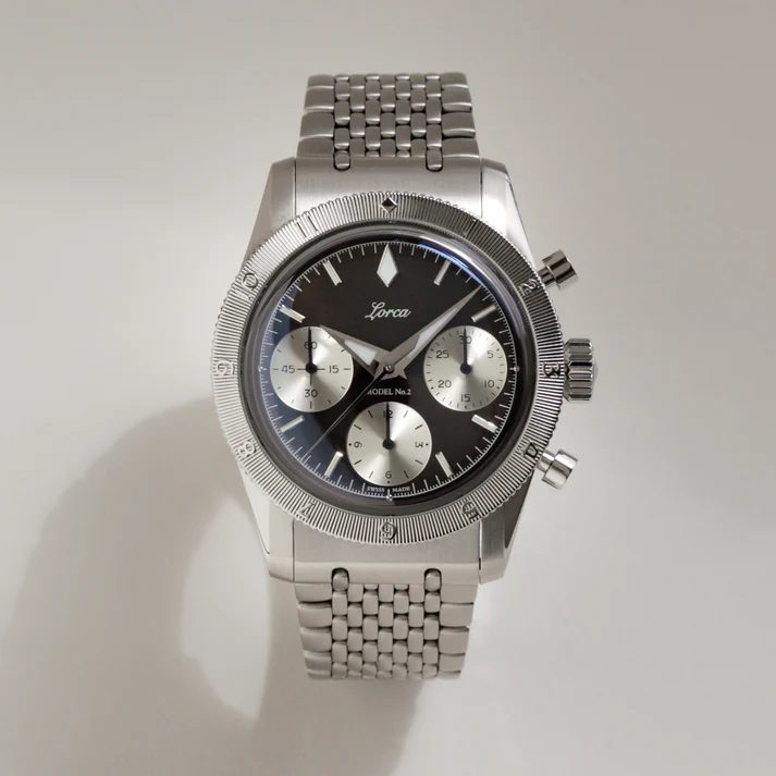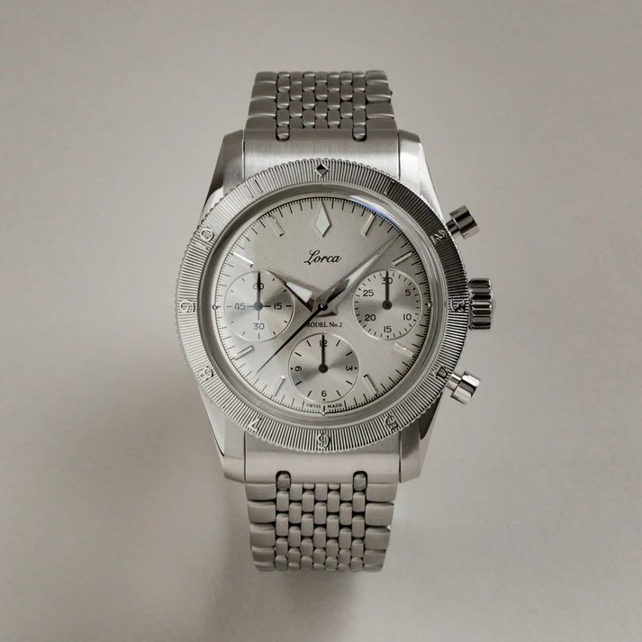 さらに、LORCAは新たに「Model No.2 Chronograph」を発表。クラシックなクロノグラフデザインに、スイス製の自動巻きムーブメントを搭載し、視認性と操作性を両立。直径38mmのケースサイズで、スポーティかつエレガントな印象を与える。ダイヤルはブラック/シルバー/グレーの3種類が用意され、繊細なサンレイ仕上げが特徴。100メートルの防水性能を備え、日常使いにも適した仕様となっている。LORCAの目標は、細部までこだわった設計に支えられた、シンプルかつ精緻な製品を提供すること。その時計は、日常の中で使われることで一層魅力を増し、長く愛される存在となることを目指している。