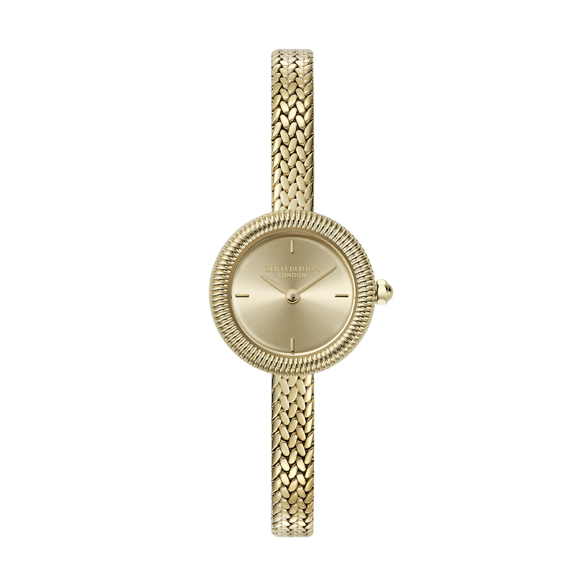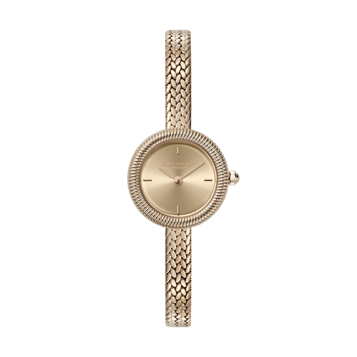 ブランドのアーカイブにあるヴィンテージデザイン、そしてオリビア・バートンのシグネチャーであるグログランリボンからインスピレーションを得た特別なシリーズです。20mmの小ぶりなケースには、繊細な“ツイスト”ディテールを施したテクスチャードベゼルを採用。ダイアルにはトーナルカラーのサンレイ加工を施し、シルバー、ゴールド、ローズゴールドの3種類をご用意。控えめなインデックスと組み合わせ、洗練された手元を演出します。ヴィンテージ感漂うメッシュストラップと組み合わせることで、クラシックとコンテンポラリーが美しく融合したミニウォッチが完成しました。