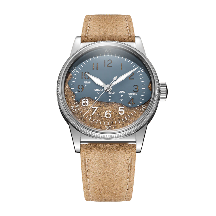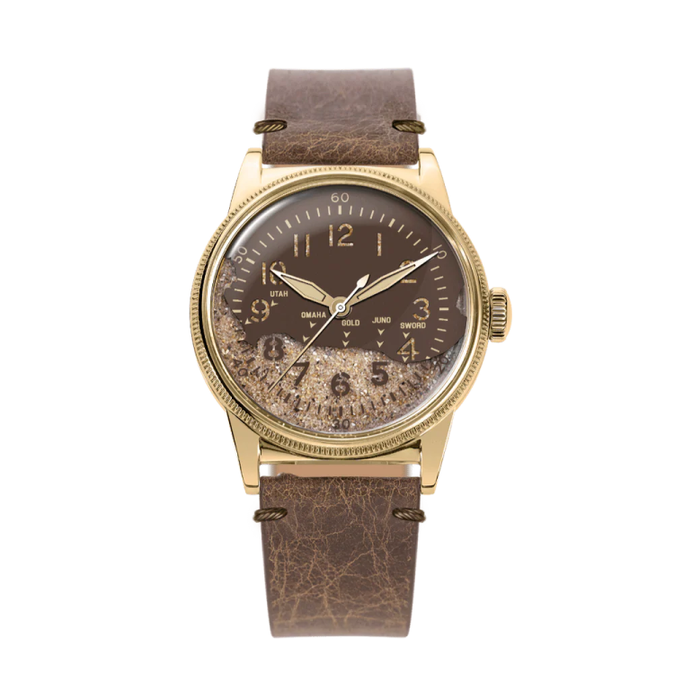 ノルマンディー上陸作戦から81周年を迎え、平和の記念として作られた特別なモデル。最大の特徴は、実際にユタ・ビーチから採取された砂を文字盤に封じ込めたダイヤル。上半分は砂がそのままインデックスとして現れ、下半分にはホワイトの蓄光インデックスを配置。ノルマンディー海岸線をかたどったカットアウトと、5つの上陸地点のマーキングが歴史の記憶を鮮明に刻みます。ケースバックには勇気を象徴するD-Dayの印象的なイメージを刻印。シリアルナンバー入りで、一本ごとに唯一無二の存在感を持たせています。