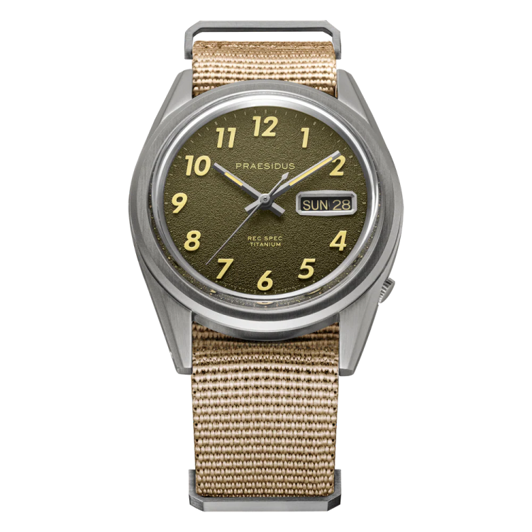オリジナルの MACV-SOG に着想を得た堅牢なDNAを受け継ぎつつ、現代的に再解釈された Rec Spec EX シリーズ。超軽量かつ耐食性に優れたグレード2チタンを採用し、マットなビーズブラスト仕上げを施したケースは、反射を抑えたステルス性を備えている。ケース径は38mm、4時位置の統合型リューズによる高い保護性、そして薄型で安定した装着感を実現。内部には信頼性の高いNH36 TMI 自動巻ムーブメント を搭載し、41時間のパワーリザーブ、ハック機能、そしてデイデイト表示を備えた。Rec Spec EX が「未来的な実験」とするならば、Rec Spec EX OG-107 は「伝統への敬意と創造性」。同じDNAを持ちながらも、異なる表情でフィールドに寄り添う2つのモデル。