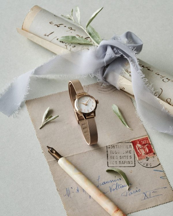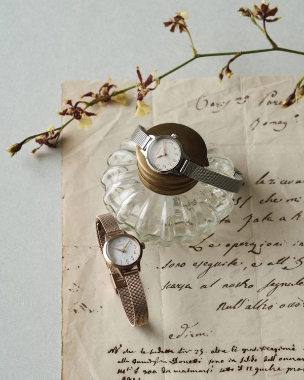 雲ひとつない夜空に浮かぶ清らかな月。その透明で揺るぎない光は、静かに心を照らし、澄み渡る美しさを映し出します。『清月』は、この清らかな月の輝きにインスパイアされたモデルです。21.5mmの小ぶりなラウンドケースは、手元に凛とした上品さを添えながらも、どこか親しみやすさを漂わせます。アラビア数字のインデックスは一目で時刻を読み取れる視認性を備え、日常に寄り添う実用性を実現。さらにドーム型のミネラルガラスが柔らかな陰影を生み、温もりを感じさせる表情を与えます。今回新たに加わったメッシュバンドは、月光のきらめきを繊細に編み込んだかのような輝きをまとい、シルバーとローズゴールドの2カラーで展開。ステンレススチール製のしなやかなメッシュは軽やかで肌に馴染みやすく、ジュエリー感覚で腕元を飾ります。澄み渡る夜空に輝く月のように、清らかでありながらもやわらかな存在感を放つ「清月」。新作メッシュタイプは、日常の装いをさりげなく格上げし、特別な日には華やぎを添える一本として、身につける人の時間に寄り添います。