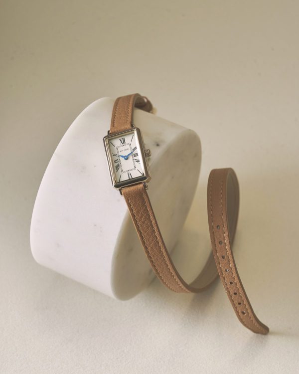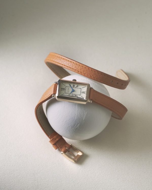 前作「月華」が纏っていたのは、ステンレスバングルの凛とした輝き。今作ではその輝きに、よりしなやかな“流れ”が重なります。手首を静かに2周するレザーストラップが、月光のように腕に沿い、花のように軽やかに美しく、確かな存在感をまとわせます。小ぶりなスクエアケース(29mm×19mm)は同じ佇まいのまま、素材の変化が“新しい表情”を生み出しました。細くしなやかなレザーが二重に重なることで、一本の線では生まれない“奥行き”と“動き”が腕元に生まれ、その重なりが月が描く静かな流れのような優雅さを添えます。柔らかなラインが腕元に自然な広がりを生み、アクセサリーのような軽やかさで日常を彩ります。光と影の調和が生む、月華の世界観。クラシカルなローマ数字、ミニマルなフェイス。それらが二重レザーの質感と重なり合い、“線の美しさ”と“余韻”をより際立たせます。レザーがつくる柔らかな影、ケースが放つ控えめな光。そのコントラストが、ツキコレクションが描いてきた静かな美の世界観をより豊かに広げていきます。