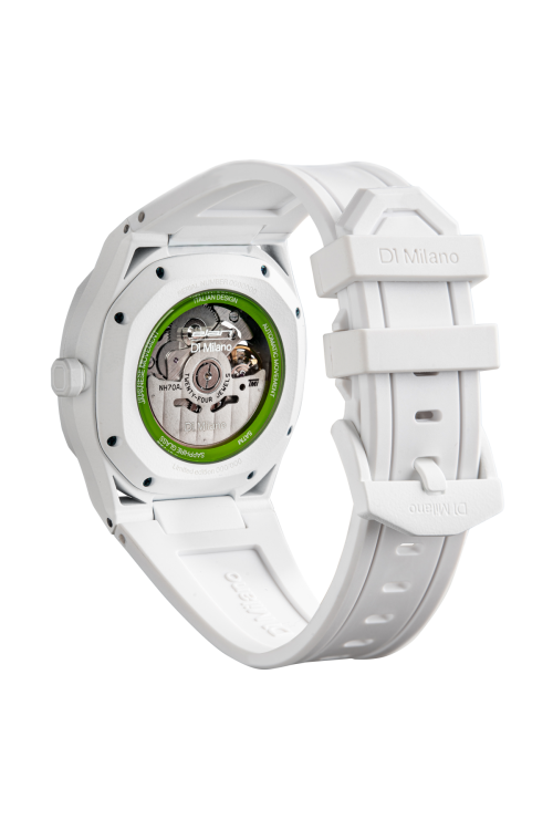 本コラボレーションは、「Elan」がスキーの概念を革新してきた先鋭的な設計思想と「D1 Milano」が追求するミニマリズムが交差したプロジェクトです。スキーと時計。ジャンルは異なれど、「余白を削ぎ落とし、本質だけを際立たせる」という理念はひとつ。ここでの透明性は、単なるデザインテーマではなく、構造・素材・精度を“見せる”ための言語です。軽量かつシャープなドリルケース、角度を強調するオープンワーク構造、奥行きを持たせたマットホワイトのスケルトンダイヤル。視覚からも触感からも“メカニカルな本質”を感じられる設計となっています。