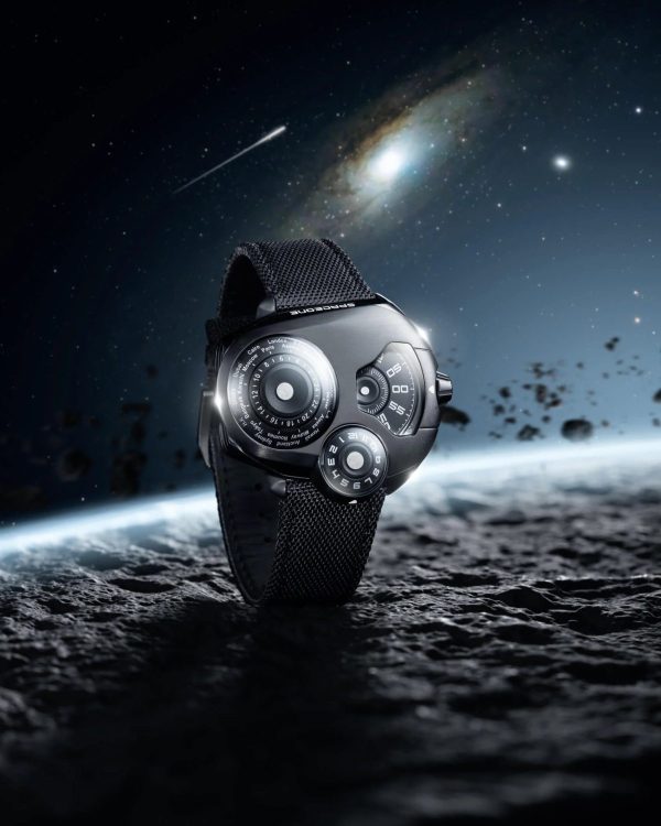 WorldTimerは、3時位置に分と秒のディスク、6時位置に12時間ディスク、9時位置に24時間ディスクと都市名ディスクを同軸で重ねたワールドタイム表示を搭載。盤面そのものが動くように時間が示されることで、まるで小さなアナログコンピュータのような動きを見せ、SpaceOneならではの世界観を感じられる設計となっている。操作を担う右側のクラウンは三段階構造で、第一段階は手巻き、第二段階は都市名ディスクのみの調整、第三段階では12時間ディスクと24時間ディスクを同期して動かすローカルタイム設定に使用する。複雑なワールドタイマーながら直感的に扱える設計で、旅行や出張にも便利な実用性を備えている。