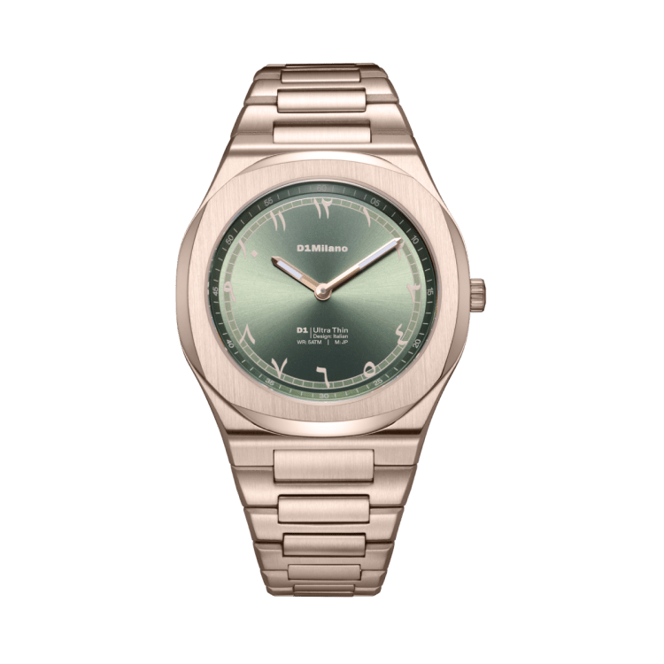 深みのあるオリーブグリーンダイヤルに、外周へ配置したアラビア数字モチーフを組み合わせたデザイン。ミニマルなフェイスの中にさりげないアクセントを加え、静かな存在感を演出します。ゴールドトーンのケースとの組み合わせにより、クラシックすぎないモダンなバランスに仕上げています。
