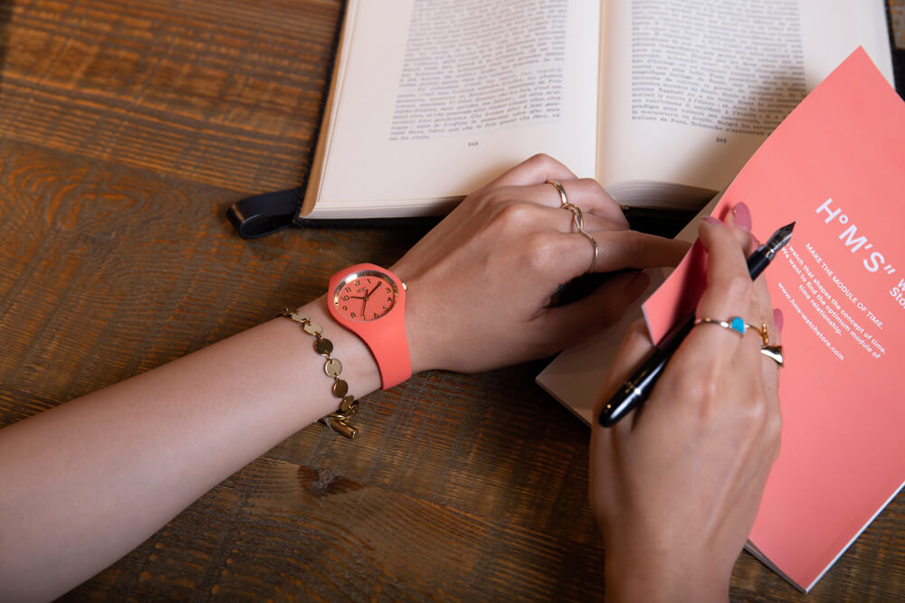 デザイン業界だけではなく、ファッションやインテリアなど様々な場所で目にすることが増えている「リビング・コーラル」をアイスウォッチのしなやかなシリコンラバーと文字盤に落とし込み、ゴールドのアクセントを加えた新モデルは、腕元に添えることで普段のスタイリングを明るく新鮮な印象にしてくれます。
