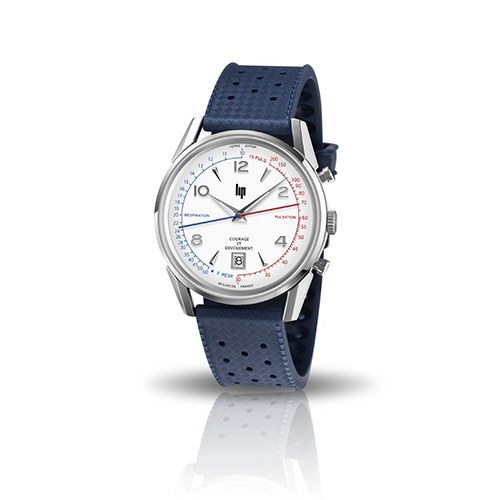 「COURAGE(クラージュ=勇気)」と名付けられた同モデルには、消防士、医師、看護師、応急救護のボランティアが、緊急事態の際に正しい判断が出来るように、本格的な機能が搭載されている。右半分の赤いゾーンが脈拍計、左半分の青いゾーンが呼吸計測器の機能を担う。クロノグラフをスタートし、基準回数をカウントしところでストップを押すと、クロノグラフ針が指している数字が、一分間の脈拍数、または呼吸数を示してくれる仕組みになっている。これにより、救護人が正常な脈、呼吸をしているかを判断できるのだ。