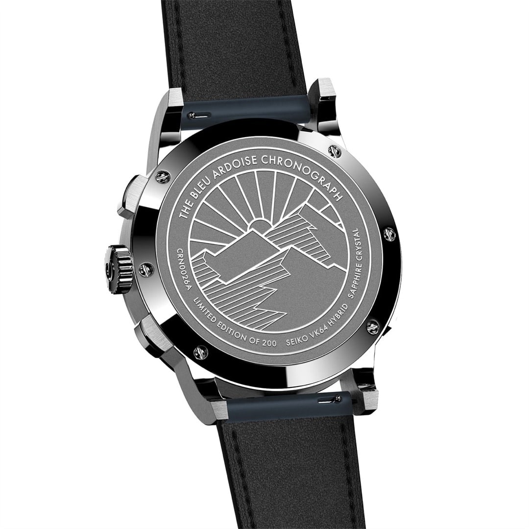 コーニッシュはフランスのコート・ダジュールからデザインインスピレーションを受けているブランドで、今回のモデル名である『アルドワーズ』はフランス語で”スレート”を意味する。“スレート”とは主に屋根材に使われる素材で、フランスは世界で最も屋根にスレート材を使用している国として知られている。コーニッシュでは春の訪れを祝うかのように毎年この時期にブルーダイアルを使用したモデルを限定生産しており、今年はスレートの素材感を表現するためにマット仕上げされたセラミックダイアルを採用し、アクセントとしてセコンドハンド、カウンターハンドにオレンジカラーを使用している。シンプルなダイアルとのメリハリをつけたシルバーの2カウンタークロノグラフにタキメーターインナーベゼル、柔らかみを感じられるアラビア文字のインデックスが高級感を演出し、往年のアンティークウォッチを彷彿とさせるデザインとなっている。 ケースバックにはフランスのコート・ダジュール海岸の上に聳え立つ山々に昇る太陽が描かれており、フランスリスペクトを感じることが出来る。ムーブメントはSEIKO製VK64メカクオーツを搭載しており、クオーツでありながら機械式さながらの運針が可能となっている。ドーフィン針が手元をラグジュアリーに飾り、細部にまで拘り抜いた遊び心を忘れない大人のファッションウォッチとして提案する。2022年4月8日(金)より、全国のH°M’S” WatchStore、取扱い店舗、及び公式オンラインストアにて発売開始。