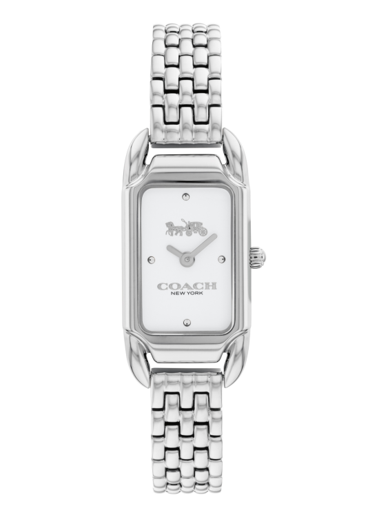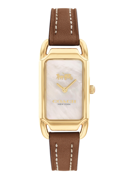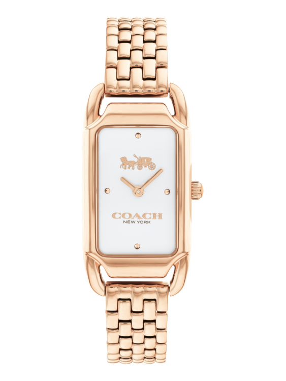 1920年代のアールデコにインスパイアされたレクタンギュラーケースのコレクション"ケイディ"からは、レザーのブレスレットタイプのベルトが登場する。コーチのアイコニックな馬と馬車のモチーフを文字盤の中央に配し、無駄のない洗練されたシルエットが大人の雰囲気を放つ。