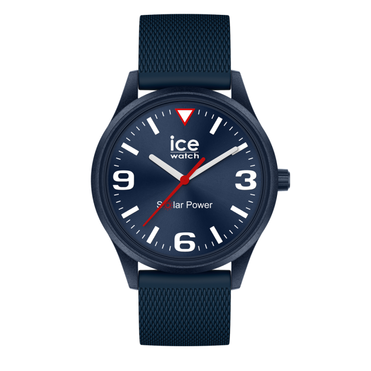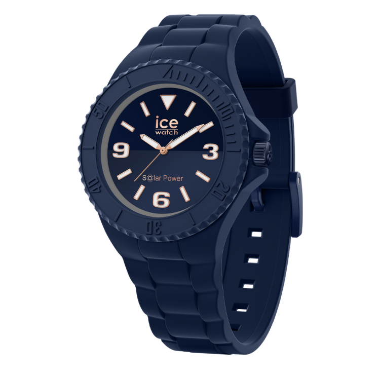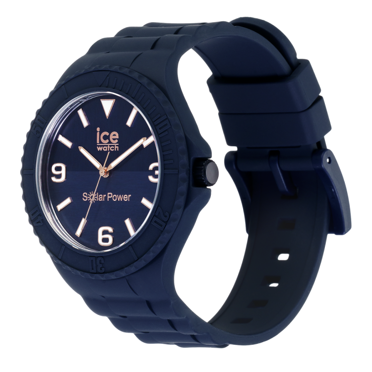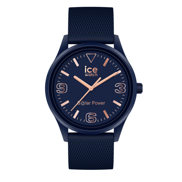 ケースとベルト一体型のシリコンラバーでダイバーズウオッチデザインを再現したソーラーモデル。ケース径44mmとビックフェイスだが、厚さ10mmと薄型で申し分ない着用感。全体をネイビーで統一し、ローズゴールドパーツで上品に引き締めた。文字盤のサンレイダイヤルっは上下中央で放射仕上げの向きを変え、上は空、下は海を表現。アイスウォッチストア及びアイスウォッチステーション限定販売。
