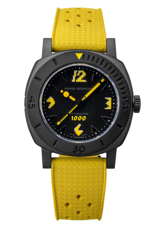 アーケードゲームのスクリーンバックにパックマンが映し出される様子からインスピレーションを受け、時計全体の色合いをブラックで統一し、インデックスには象徴的なビビットなイエローを用いた。ダイアルに刻まれた防水性を示す「1000」の文字はまるでゲームの中でハイスコアを叩き出したかのような感覚を思い出させるデザインとなっています。細部に目を向けると、ダイアル全体がグリッドパターンにエッチングされており、立体的にデザインされたインデックスにはルミノバ加工も施されています。