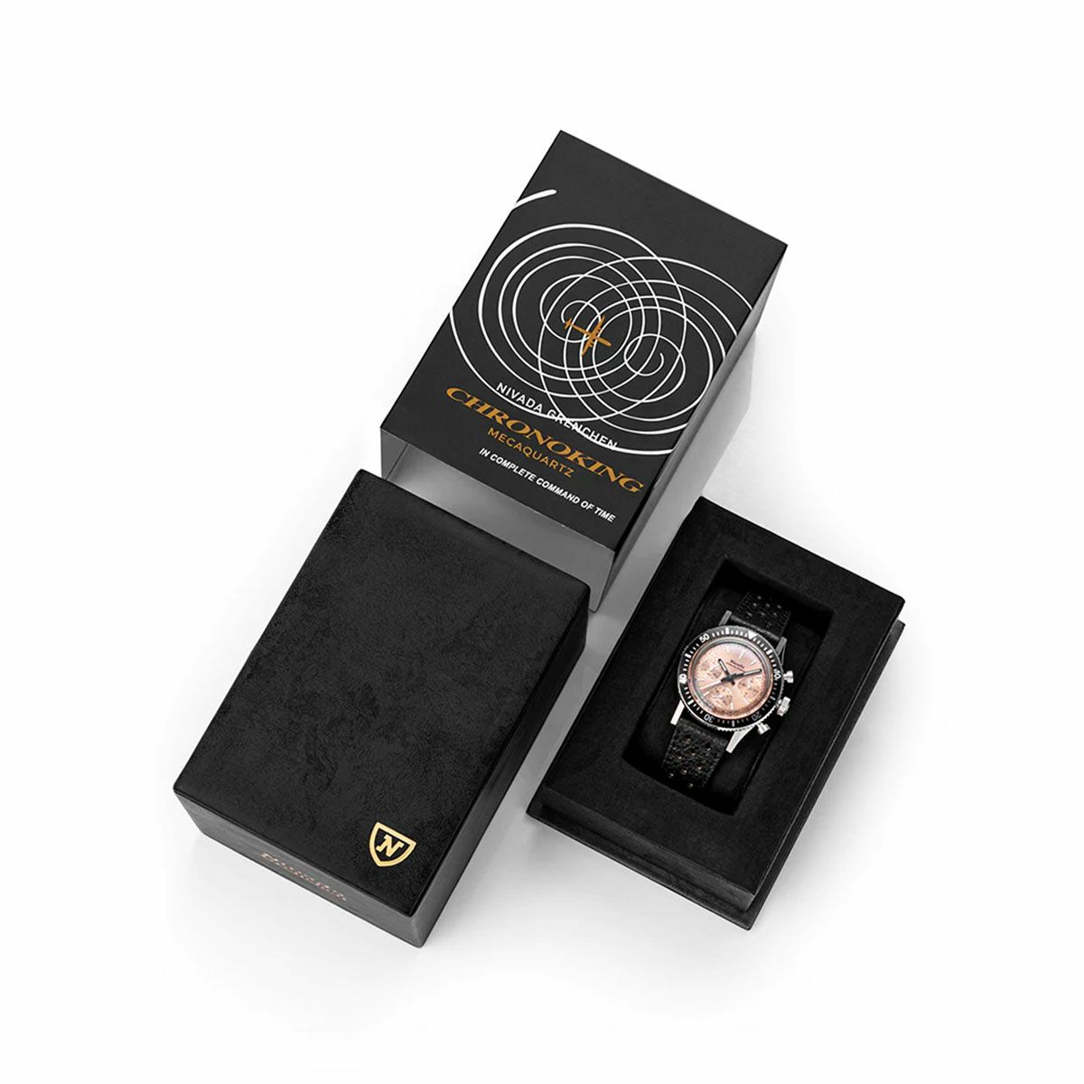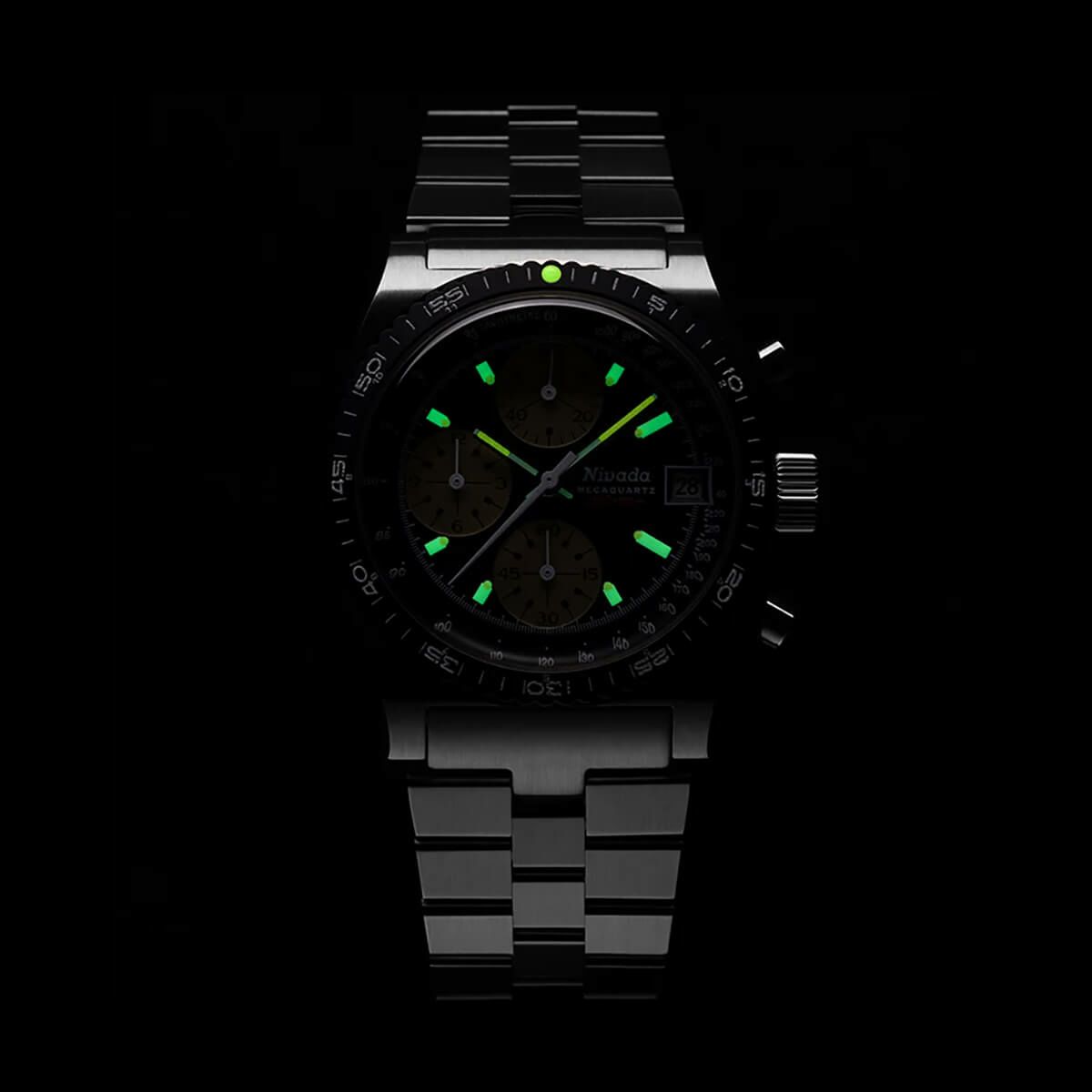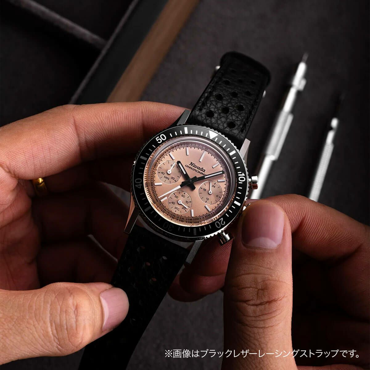 NEW Sold out. 他の画像を見る Nivada Grenchen / ニバダ グレンヒェン クロノキング メカクォーツ レーシング ブラック トロピックラバーストラップ / インターチェンジャブル5ベゼルセット ¥ 110,000 税込