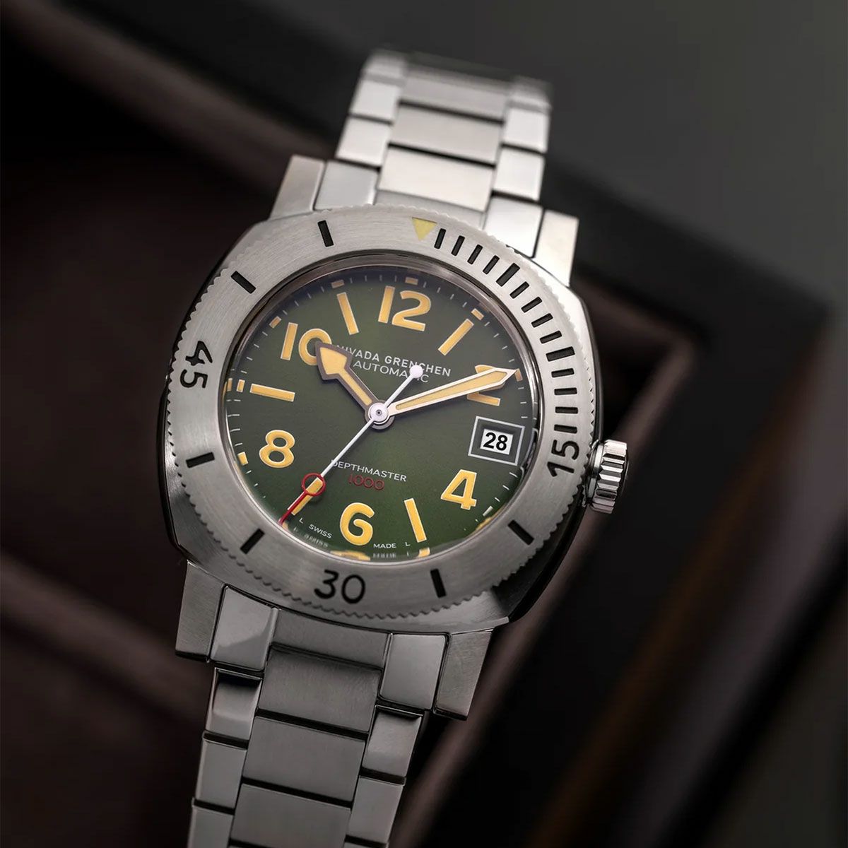 Sold out. 他の画像を見る Nivada Grenchen / ニバダ グレンヒェン デプスマスター グリーンダイヤル デイト ステンレススチール フラットリンクブレスレット ¥ 209,000 税込