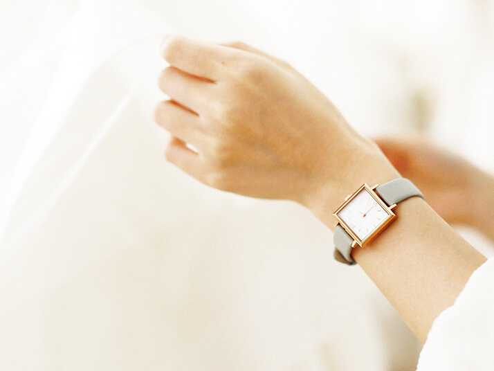 都内のスタジオには、丁寧にリペアされたアンティークの家具と、新しい花嫁の1日を待つドレスたちが並ぶ。繊細なレースやふんわりとしたチュールに触れる手に、少し小ぶりな、ローズゴールドと優しいグレーのレザーが印象的なOlivia Burtonのスクエアウォッチが居心地よさそうにつけられたいた。